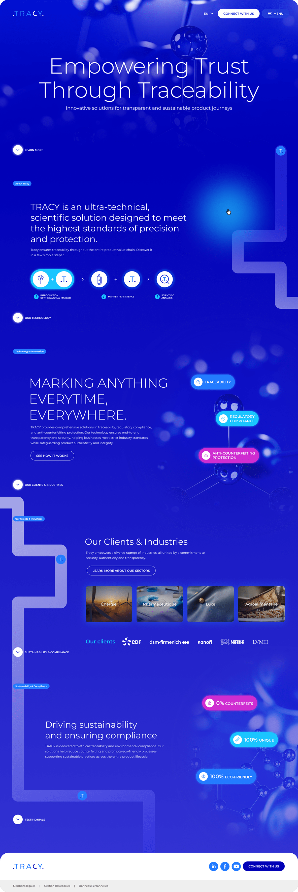 Tracy révolutionne la traçabilité avec une technologie innovante qui authentifie et sécurise les matériaux à l’échelle atomique. Nous les avons aidés à élargir leur impact au-delà de l’agroalimentaire en développant une nouvelle plateforme de marque, un site et des outils dédiés. Notre mission : rendre accessible une solution technique de pointe pour maximiser la transparence et la valeur perçue.